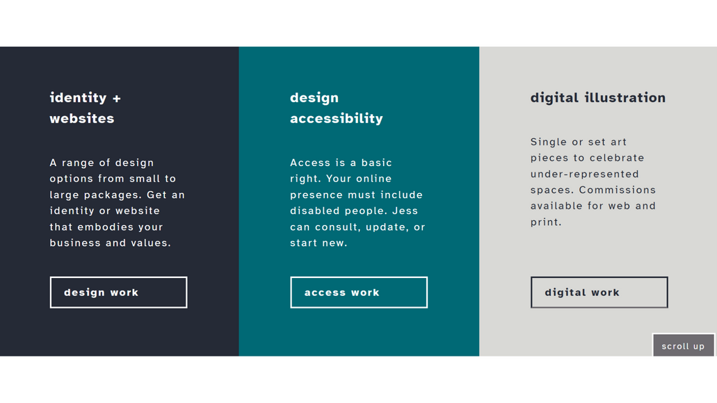 My fellow disabled designer! Jessica is an accessibility consultant and graphic designer who I found out about through her doing Sulaiman’s rebrand as she was the person who worked on this with him. Like myself, she has 3 main streams of services: brand identity & websites, design accessibility and digital illustration.